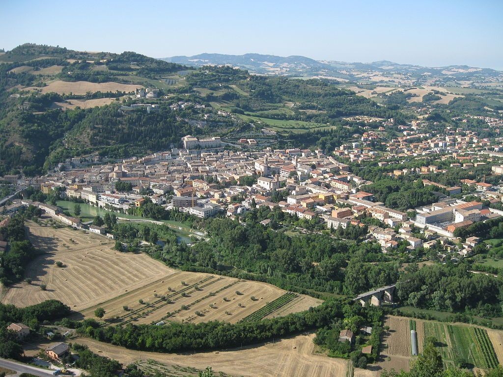 The small ancient city, founded by the Romans, lies on a slope overlooked by the Citadel and by the remains of the Fifteenth-Century Rocca Malatestiana (Malatestian fortress).